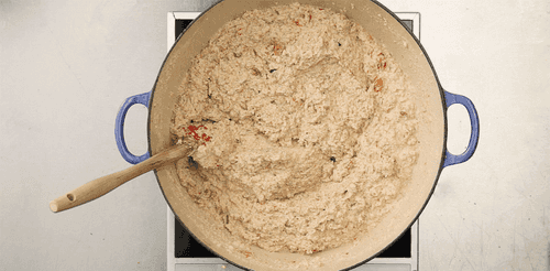When the mass thickens and the taste indicates the dish is correct, add the chopped turkey. Once the satsivi boils, add 2 tablespoons of white wine vinegar, stir, and turn off. Place in the refrigerator overnight to let the dish infuse and absorb the flavor.