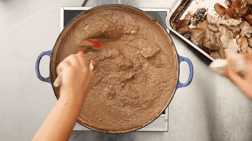 Meanwhile, roast the boiled turkey in the oven for 20 minutes at 250 degrees. Remove, cool down, and cut into portion-sized pieces - not too large but also not small like in a stew.