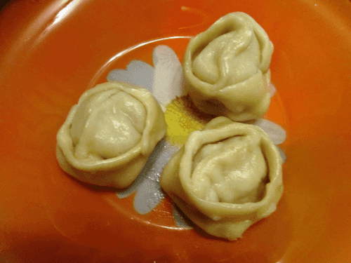 I put about a tablespoon with a small mound of filling on our circle. Then we shape the manti.