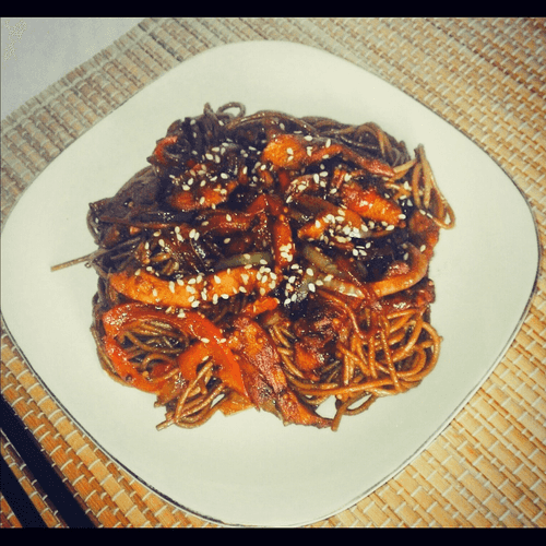 Chicken in sweet and spicy sauce with buckwheat noodles (Tori yaki soba)