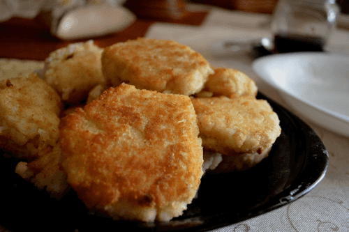 Add eggs, salt, mix, and make patties. Firm the patties well, as rice has a poor property of falling apart, especially if there are few eggs for a certain volume of rice.