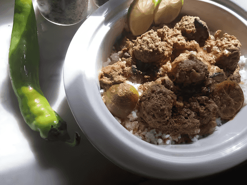 Add 2 large chopped onions, 6 cloves of garlic, and 3 eggs to the minced meat - mix well and form into balls, carefully adding to boiling coconut milk. If it's thick and doesn't cover the meat, add water. Cook for 20-30 minutes.