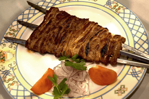 "Three fingers" - three skewers, this is how this shashlik is cleverly made, winding strips of lamb and fat tail fat on steel. This is how shashlik is prepared in Kyrgyzstan and Uzbekistan.