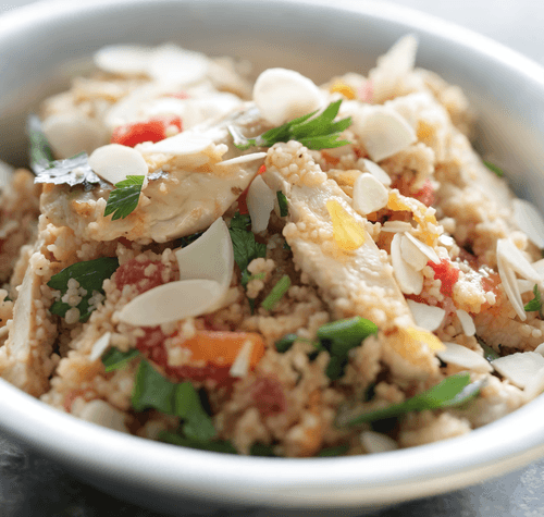 Chicken with almonds and couscous is a true celebration of Eastern flavors. This recipe from Arabic cuisine combines tender chicken fillet with the aromatic texture of couscous and the nutty crunch of almonds. The uniqueness of the dish lies in its harmony of flavors: the sweetness of raisins, the freshness of tomatoes and red peppers, along with subtle notes of nut oil create an exquisite balance. The lightness of couscous makes it an ideal side dish, while roasted peppers add a smoky touch to the dish. This meal is perfect for a family dinner or a festive lunch, offering enjoyment of refined Eastern tastes. It pairs perfectly with herbs and a light yogurt sauce.