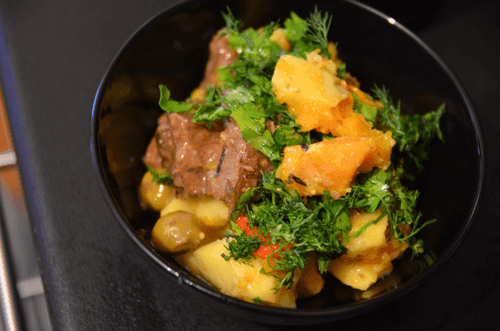 Thaw the beef if purchased frozen or simply wash and dry it with a paper towel if sold chilled, then cut into large pieces. Wash the potatoes, peel them and cut into small uniform cubes; wash the peppers, dry them and coat with 2 tablespoons of olive oil. Preheat the oven to 200°C, place the peppers in a baking dish and bake for 30 minutes. Wash the pumpkin, peel it and cut into cubes about 2 cm in size.