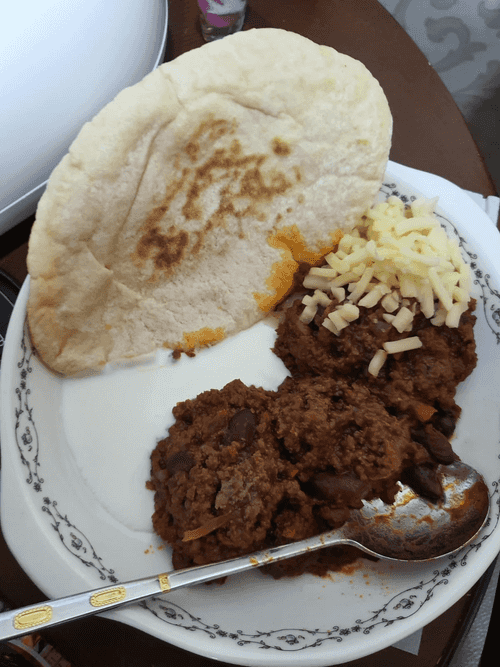 Cut the lavash in the shape of a plate. Place the lavash on the plate. In the center of the lavash, put chili con carne, on one side add sour cream, and on the other grated cheese and serve.