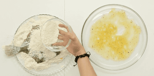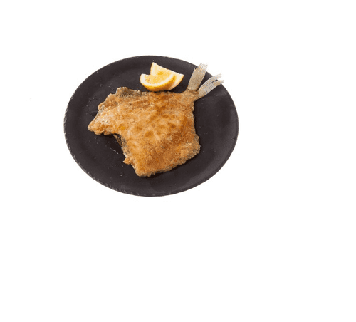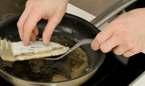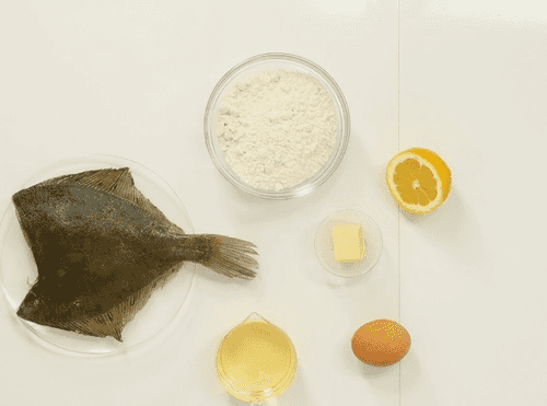 Clean the flounder, cut off the head and fins, and gut it. You can leave the tail. It's better to take a small, portion-sized flounder so that it fits entirely in the pan. Dredge the flounder in flour.