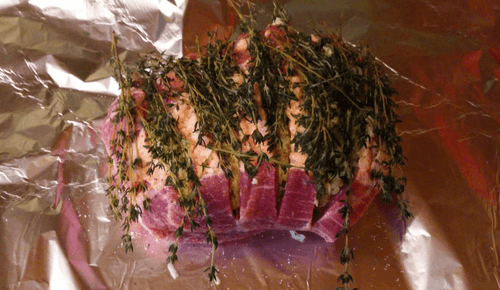 Place thyme around the meat, wrap it in foil, and send it to the oven for 1.5 hours at 165 degrees.