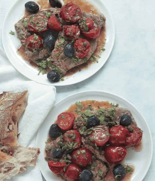 When the oil is hot, fry the steaks or escalopes on high heat for 30 seconds on each side (if you like your steaks more well-done, keep them on the heat a little longer). Then remove the pan from the heat, transfer the steaks to a large sheet of foil and wrap them to create a loose, tightly sealed envelope. At this stage, I do not salt the meat as the olives are very salty. If you are using regular pitted olives, salt the meat.
