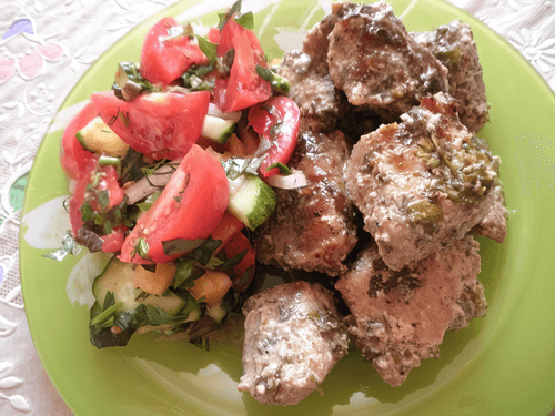 Mix the meat with greens, lemon juice, and honey. Add salt, pepper, and other spices (if desired) and mix everything thoroughly. Place the mixture in the refrigerator for 2-3 hours to marinate the meat.