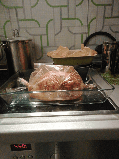 Coat the chicken with the mixture first inside, then on the back, then place it on its back in a greased baking dish and coat all remaining parts of the carcass.