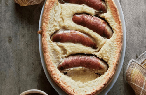 Wrap each sausage in a piece of ham and fry until golden brown. Pour the batter into a preheated baking dish, place the sausages, and bake until golden for 25-30 minutes. Serve with gravy. Enjoy your meal!