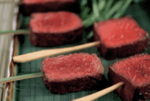 Remove the cooked steaks from the grill, cut them into small pieces, skewer each piece, and serve with fresh cress salad. Enjoy your meal!