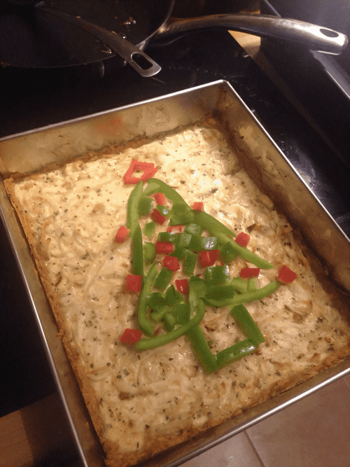 Cut the chicken into shreds. In a separate bowl, make a mixture of eggs and milk, add cheese, then the chicken and onion.