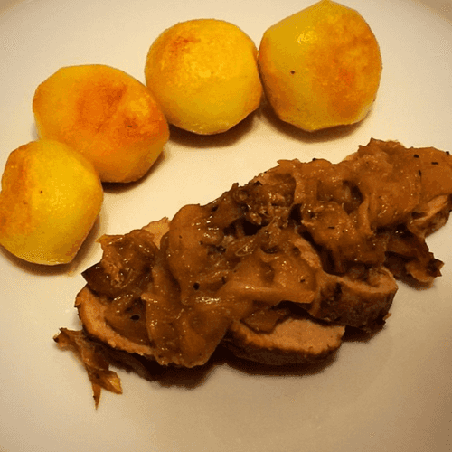 For serving, cut the meat into pieces 2 cm wide. Top with stewed apples.