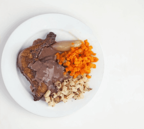 The person only needs to prepare the side dish. Cut the potatoes into cubes and fry with bacon until browned, then cover with water or broth just enough to barely cover the potatoes, add a pinch of pepper, and put on the heat. Peel the shallots and leave them whole, peel the carrots and cut them into cubes. Cook the carrots and onions in separate pots since they have different cooking times, adding water, a bit of sugar, butter (40g each), and a pinch of salt. When the water evaporates from all pots, the vegetables will caramelize. Remove from heat and slightly reheat when the rooster is ready.