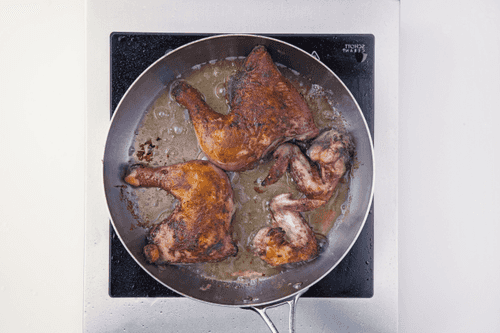 Fry the pieces of rooster on all sides until a brown crust forms. The meat should be almost cooked on the outside.
