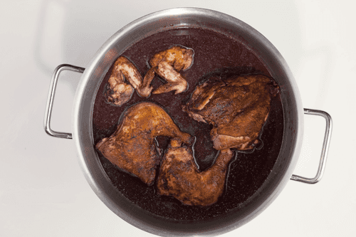 After frying all the pieces of the rooster, transfer them to a saucepan and pour in the strained marinade. Then, sealing the saucepan with foil and making a few holes in the foil for excess steam to escape, place the saucepan in an oven preheated to 180 degrees for one and a half hours. Essentially, human involvement in the rooster's fate ends here. The even heat of the oven will do the rest.