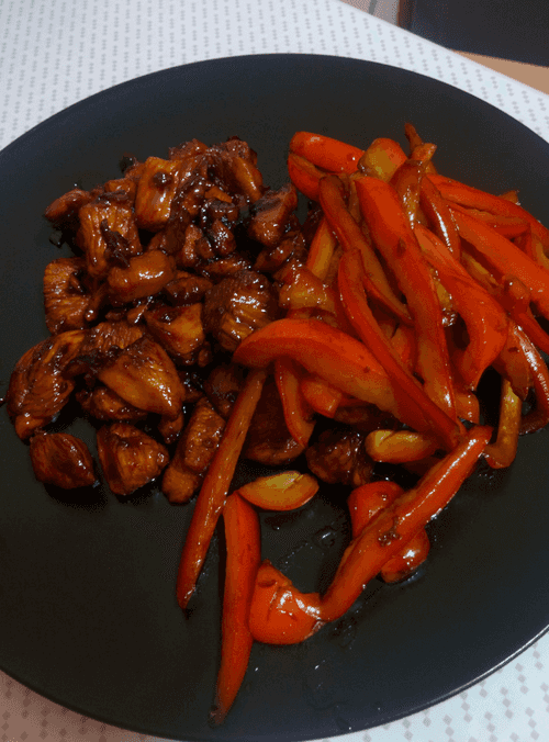After removing the chicken, add the pepper to the same pan and sauté on high heat for 4 minutes, stirring. Enjoy your meal!