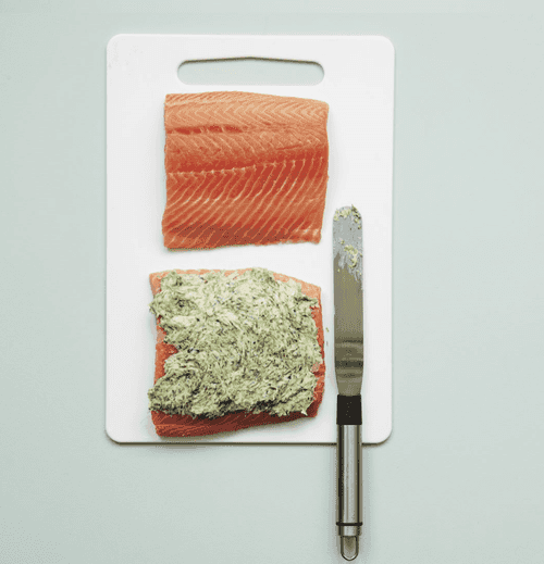 Spread butter evenly on the inside of the salmon fillet and cover with another fillet.