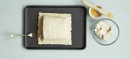 Trim the uneven edge of the dough and press around the perimeter with a fork to create a pattern. Brush with egg and refrigerate for 1 hour.