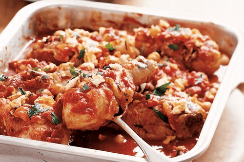Pour the chickpea-vegetable mixture over chicken drumsticks and thighs, season with salt and pepper to taste, and bake in a preheated oven at 200 degrees until the chicken is cooked through. It's better to cover the dish with foil to prevent drying out.