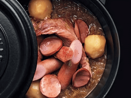Choucroute with smoked meats is a traditional French dish originating from Alsace. It is a delightful combination of sour sauerkraut, aromatic smoked meats, and tender vegetable broth with white wine. It is prepared by slow simmering, allowing all ingredients to reveal their flavors. The smoked pork belly adds richness to the dish, while sausages and salami provide meaty texture. The pork knuckle becomes tender and infused with spice aromas. This dish is perfect for cold evenings when you want to warm up and enjoy a rich taste. Choucroute is served with mustard and fresh baguette, pairing perfectly with a glass of white wine.