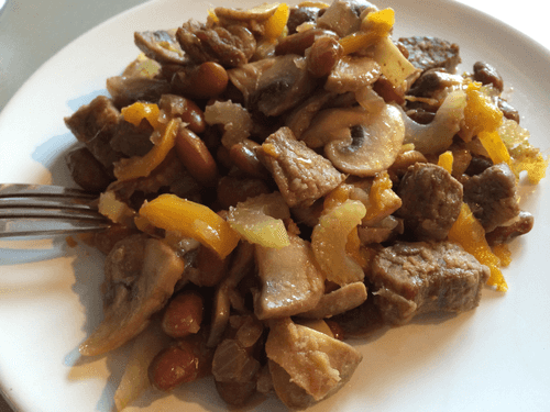 Fry the meat separately until cooked, add the vegetable mixture to the meat and simmer together for 5 minutes.