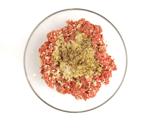 Clean the beef shoulder, chop finely or pass through a coarse grinder. Pass half of the onion with beef fat through a fine grinder. Dice the other half of the onion and sauté in butter. Mix everything, add salt and pepper, and beat well until homogeneous. Refrigerate for 30 minutes.