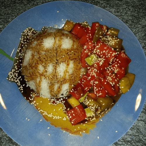 Serve the rice with vegetables on a plate and drizzle with the remaining sauce, garnishing with sesame seeds.