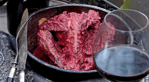 Guinea fowl with blackberry sauce is an exquisite dish of European cuisine that combines the tenderness of the bird with the rich, slightly tart flavor of blackberries. Historically, guinea fowl was considered a delicacy due to its dense, flavorful meat, and fruit sauces have always served as a magnificent complement to poultry in European culinary traditions. Roasted to a golden crust, guinea fowl becomes juicy and rich, while the blackberry-grape sauce with hints of nuts and honey adds an amazing depth of flavor. The light spiciness of chili harmoniously complements the sweetness of the fruits, creating a complex and rich bouquet of sensations. This dish is perfect for special occasions and festive tables, especially when served in a Georgian clay pan — ketsi, which adds aesthetics and traditional authenticity.