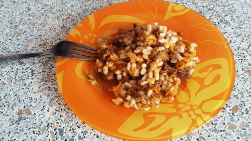 While the pearl barley is boiling, finely chop the onion and grate the carrot on a medium grater. In a cauldron or deep frying pan, add the fat from the canned meat and sauté the onion and carrot in it.