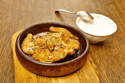 Georgian-style chicken is a vibrant embodiment of Georgian cuisine, rich in spices and aromas. The Svan mixture gives the meat a rich spicy flavor that is perfectly complemented by a delicate sour cream-garlic sauce. Historically, this recipe traces back to traditional Caucasian methods of cooking meat—roasting with minimal oil to preserve its juiciness. The baked chicken comes out with a crispy crust and juicy flesh, while the added garlic sauce enhances its rich taste. This dish is perfect for both festive gatherings and cozy family dinners, filling the home with the warmth of Georgian hospitality.