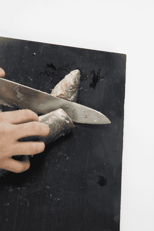 Rinse the navaga under running water, cut off the head, tail, and fins, and clean out the insides. If the navaga is large, cut into portions; if small, leave whole.