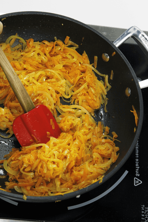 Slice the onion into half rings and grate the carrot on a coarse grater. Sauté the vegetables until half cooked.