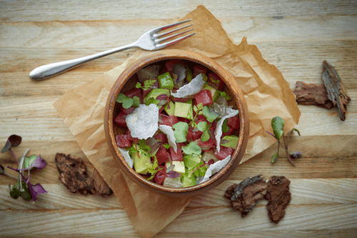 Chopped tuna with avocado and rice chips is a refined dish that combines the freshness of seafood with the rich flavor of yuzu sauce. This is a modern interpretation of European cuisine with Asian notes. The tender tuna fillet harmoniously pairs with creamy avocado and juicy pomelo, while crispy rice chips add textural contrast. Dressed in yuzu sauce, which unites citrus tartness, spiciness from chili pepper, and umami from fish broth, this salad becomes a true gastronomic masterpiece. The dish is perfect for a light dinner or as an exquisite appetizer on a festive table.