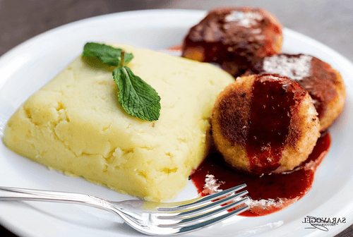 Once the potatoes are boiled, drain the water and dry them a bit in the same pot. Then mash with a masher into a uniform mixture or pass through a potato ricer. Add salt if necessary and mix again. Heat a dry skillet, place the potato mixture in it and add cubes of frozen butter. Then on low heat start to incorporate the butter into the potatoes with a silicone spatula until you get a uniform plastic mixture. Place the finished puree in a mold and serve on a plate, garnished with two mint leaves on top. The garnish is ready.