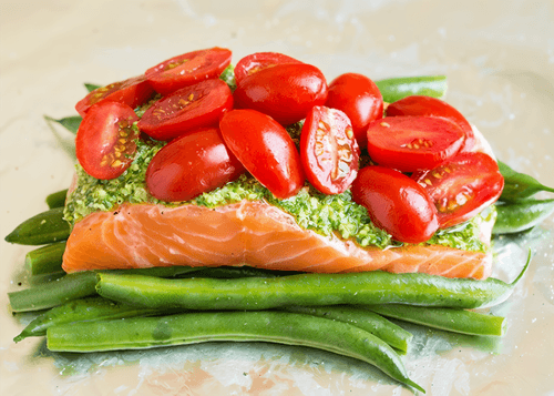 Salmon baked with green beans and pesto sauce is an exquisite dish of European cuisine that combines the freshness of vegetables, the tenderness of fish, and the aroma of Italian sauce. This recipe is inspired by Mediterranean traditions where pesto is an integral part of gastronomy. Salmon infused with the spicy flavor of basil sauce and lemon juice acquires a rich aroma and soft texture. Asparagus and cherry tomatoes add vibrant colors and light freshness to the dish. Baking in foil helps retain the juiciness of the ingredients and reveals their natural flavors. This dish is perfect for a romantic dinner or festive gathering, delighting with its elegant appearance and harmonious combination of flavors.