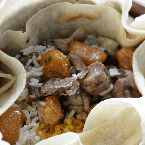 Add the dried apricots and chestnuts, mix and simmer together for another 2-3 minutes, then add to the rice and mix without damaging the lavash.