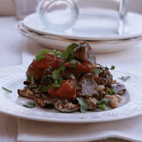 Lamb with vegetables and chickpeas in Moroccan style is a gastronomic journey that combines the traditions of Eastern cuisine with Mediterranean flavor notes. Although the name refers to Morocco, the dish has also found its place in Greek cuisine where Eastern spices harmoniously blend with local ingredients. Baked eggplants add softness and sweetness while chickpeas provide a light creamy texture. Spices like cumin, coriander, fennel, and paprika create a deep aroma enveloping the lamb and vegetables in warm spicy tones. Tomatoes add freshness while cilantro completes the composition with green notes. Each spoonful of this dish is a wealth of flavors where the tenderness of meat meets the spiciness of spices. It is served hot alongside fluffy bread or rice, perfectly complementing cozy family evenings.