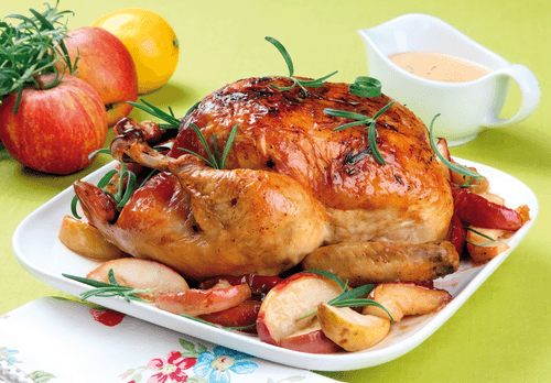 Roast the chicken until cooked, periodically basting with the juice from the chicken and apples.