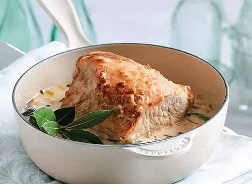 Place the meat in the pan and pour in hot milk. Simmer on low heat with a lid for 1.5-2 hours. Flip the piece of meat halfway through cooking. Add warm milk if necessary.