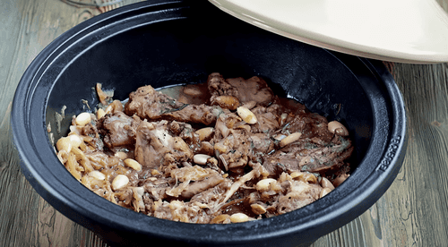 Tajine of guinea fowl with peaches, almonds, and roses is a poetic embodiment of Moroccan cuisine, where each ingredient weaves into a harmony of flavors and aromas. The tender guinea fowl meat, infused with spices, acquires a golden crust, while almonds add nutty depth. The sweetness of dried peaches gives the dish a refined fruity note, and saffron brings precious Eastern tones. Rose petals are the final touch that adds aristocratic elegance and a delicate fragrance to the dish. Slowly cooked tajine reveals its bouquet gradually, turning each spoonful into a gastronomic journey through sunny Morocco. The perfect combination of sweet and savory makes it not only an exquisite treat but also a symbol of the magic of Eastern cuisine.
