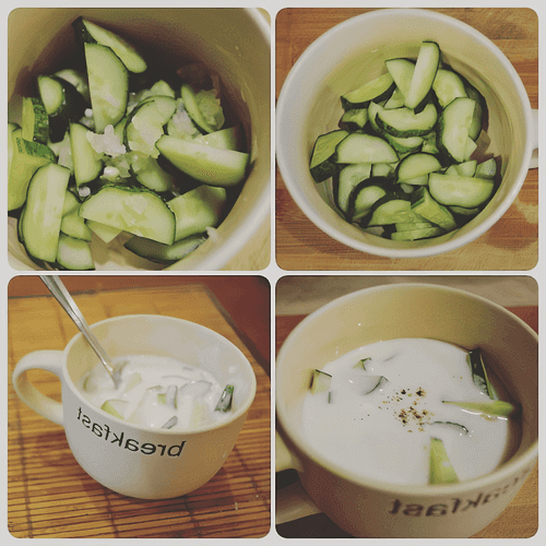 Wash and slice the cucumber into half-moons. Place it in a bowl.
