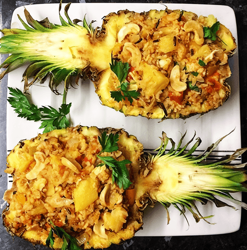 Fill the pineapple boats with fried rice and place them in the oven for 10 minutes before serving.