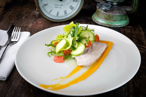 Mix zucchini, grapefruit, tomatoes, and salad mix. Place pumpkin sauce on a plate, then add turkey fillet on top. Add vegetables and drizzle with olive oil.