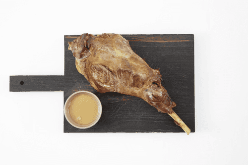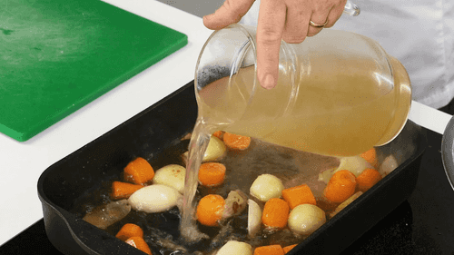 Pour the broth over the vegetables and return the leg. Place in an oven preheated to 180 degrees for one hour.