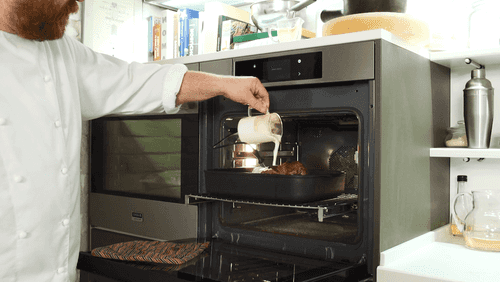 After an hour, pour coffee and cream over the lamb leg and continue baking for another hour.