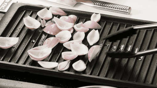 Cut the shallot in half and separate it. Sauté it on a grill pan until browned and transfer to a clean dish.