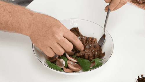 Place a mix of salads on a plate, top with pickled onions, add a few drops of marinade, layer the meat on top, and sprinkle with pink pepper.
